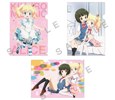 アリスの描き下ろしイラストほか、可愛いイラストを多数使用したA4サイズのクリアファイル3枚セットです。